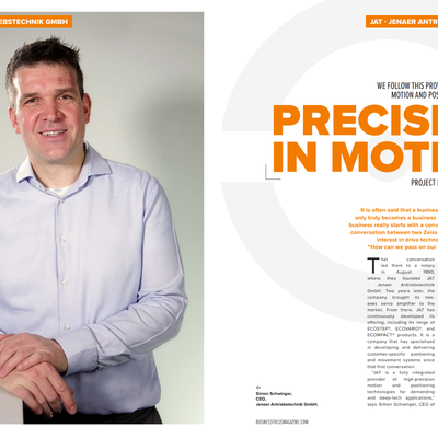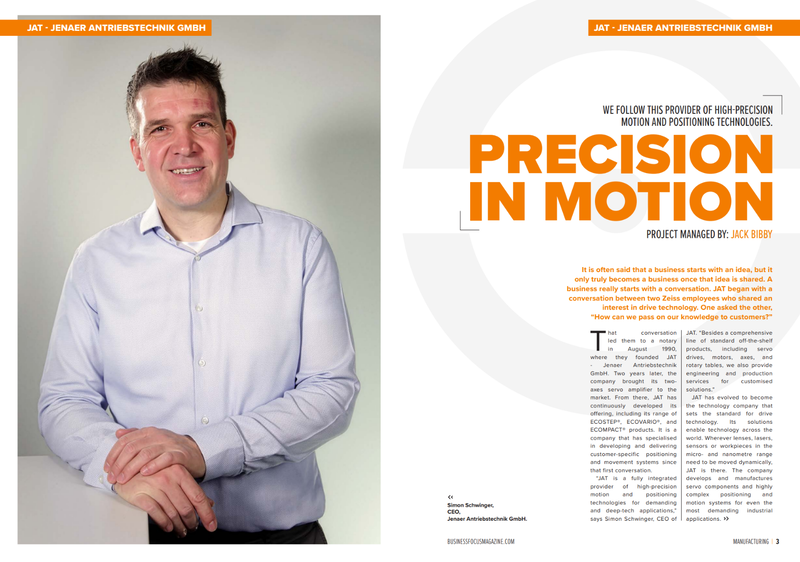 Im aktuellen Business Focus Magazine spricht unser CEO Simon Schwinger über die Entwicklung von JAT, die Bedeutung kundenspezifischer Motion-Lösungen sowie die Rolle von Innovation, Nachhaltigkeit und Teamkultur für den zukünftigen Erfolg des Unternehmens.