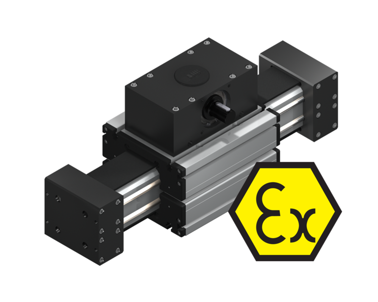 Das anschlussfertige Linearachssystem ELFZex besteht aus einer speziellen Hubeinheit mit außenliegenden Rollführungen und exakt abgestimmten Antriebskomponenten (Servomotor & Servoverstärker). Der Antrieb erfolgt über einen umlaufenden Zahnriemen. Die Arbeitsweise entspricht der eines einfachen Flaschenzuges. Das Positioniersystem ist zum bestimmungsmäßigem Gebrauch in explosionsgefährdeten Bereichen geeignet; z.B. in hochsensiblen Umgebungen wie der Mehlproduktion, Holzbearbeitung oder in Lackieranlagen. Das System ist für folgende Bereiche zertifiziert: